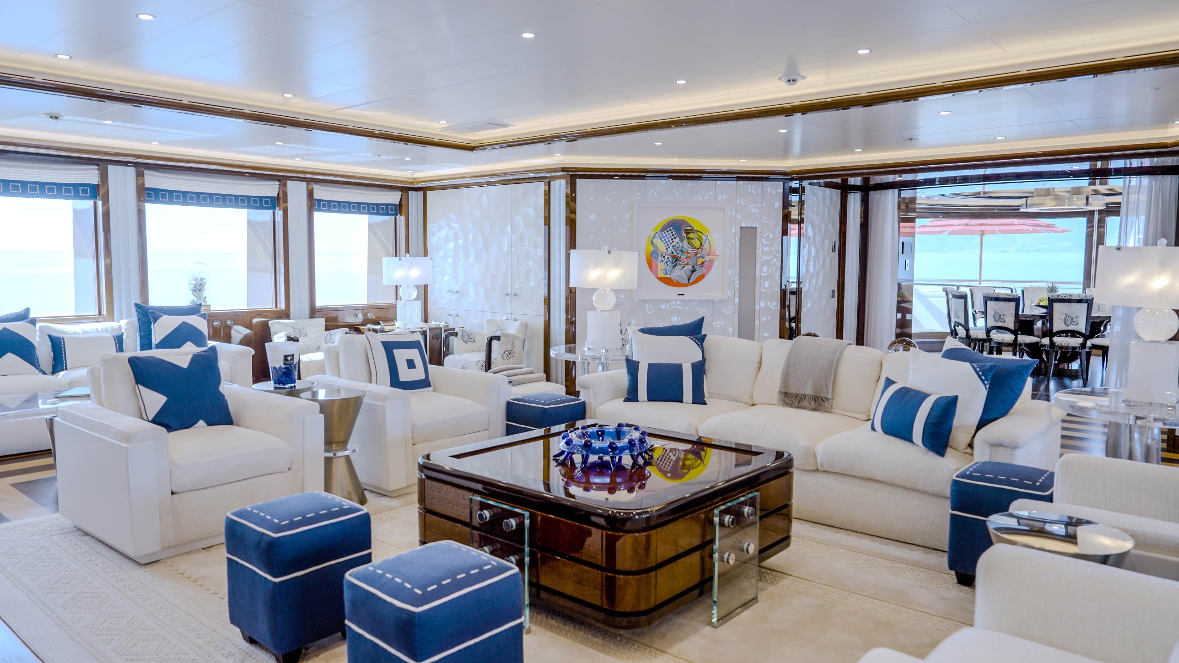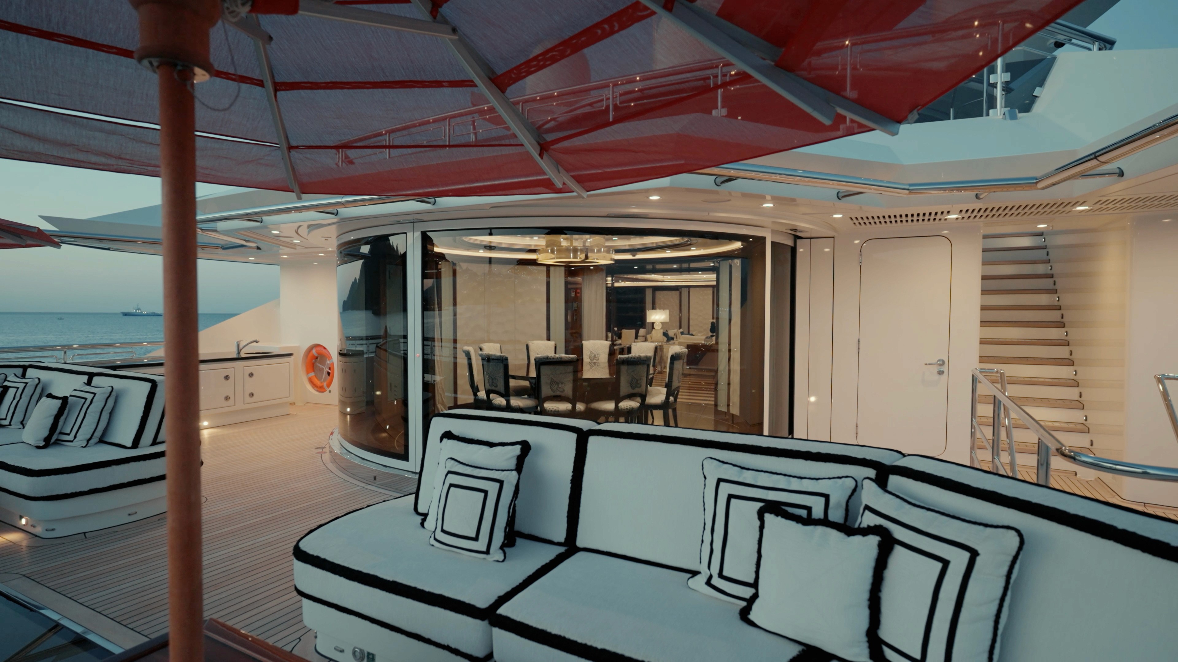 The interior by Alberto Pinto is equally distinctive: over 1,250 square metres of living space and 2,150GT of volume where pop-art and Art Deco influences meet bold colour, zigzag woodwork, and contemporary pieces by Lichtenstein and Murakami. The main saloon centres around a black lacquered Pleyel grand piano, with retractable glass doors opening directly onto the aft deck. She is not a neutral canvas—she is a statement.