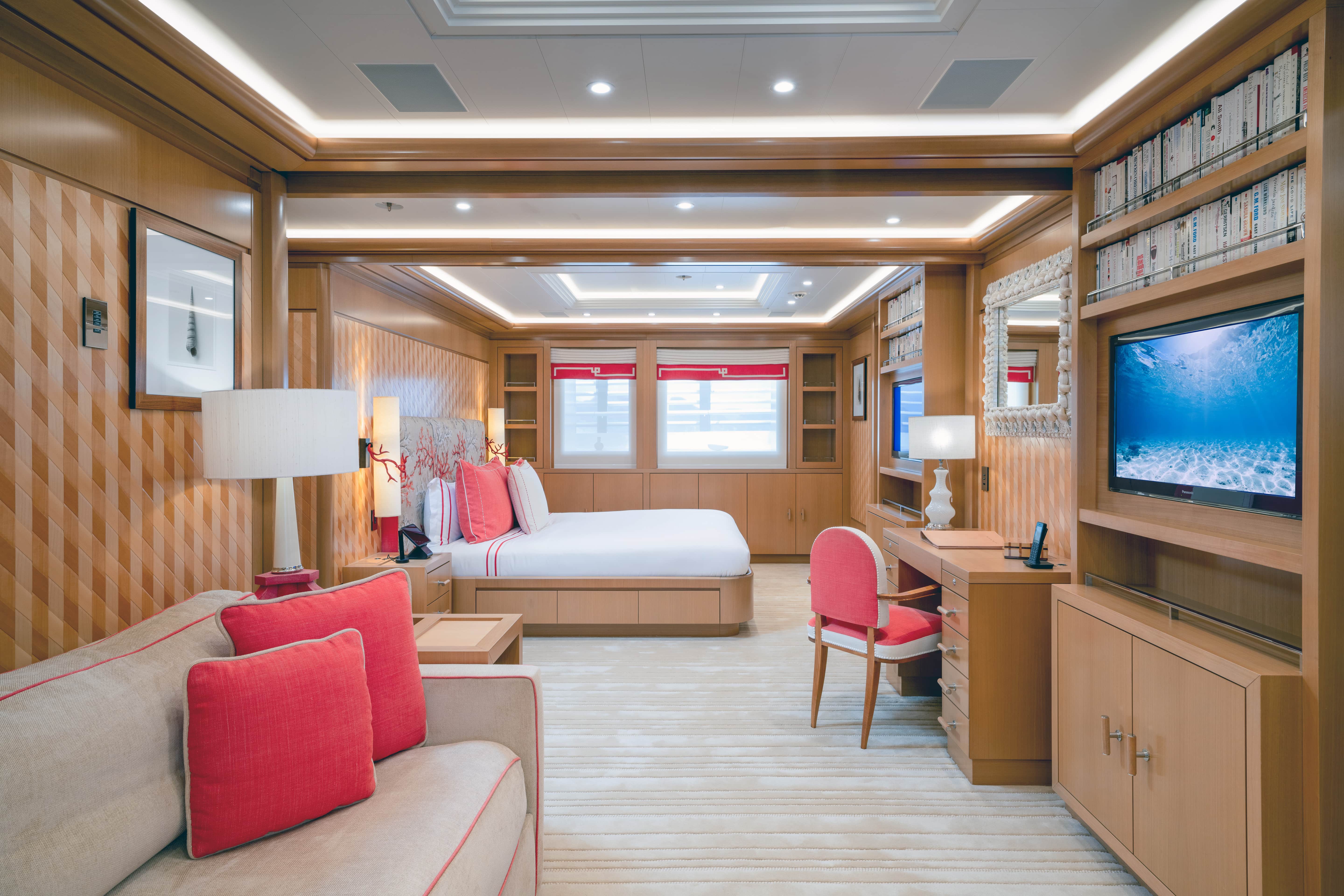Guest accommodation is distributed across the main and lower decks, with each cabin home to its own design and colour scheme—ranging from coral and blue to soft neutrals. This allows owners to host different groups without compressing the onboard experience or forcing shared routines.